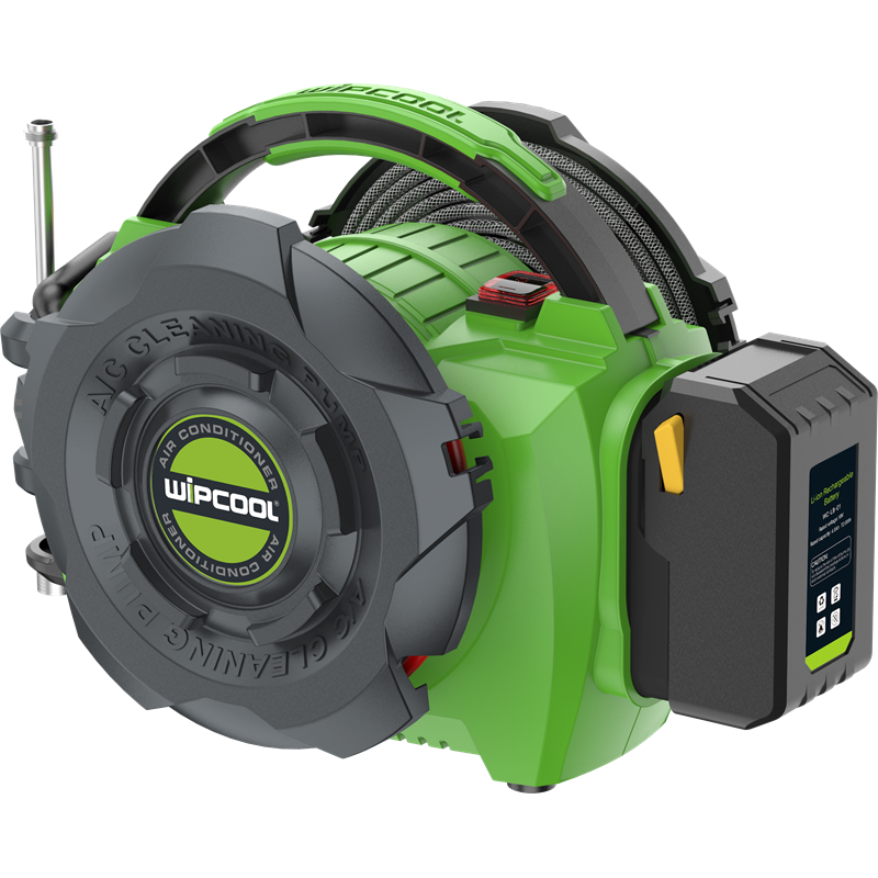 Deze draadloze (op accu) en gebruiksvriendelijke machine heeft een ingebouwde haspelfunctie voor automatisch oprollen van de inlaatslang (2,5M) en uitlaatslang (5M). Pas de reinigingsdruk aan met de dubbele reinigingsdruk-functionaliteit voor binnen- en buitenunit. Voorzien van een autostop-technologie met ingebouwde drukregelaar.